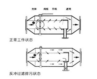 手 動(dòng)蝶閥關(guān)閉,即閥板平面與筒體軸線垂直,(此時(shí)扳手旋轉(zhuǎn)90度與筒體軸線垂直),開(kāi)啟排污閥,此時(shí)水流從進(jìn)口進(jìn)入過(guò)濾網(wǎng)筒前端,因蝶閥關(guān)閉,水流被閥板擋住,只能從前端網(wǎng)孔進(jìn)入濾筒外側(cè),大部分從出口流出,而由于排污口打開(kāi),濾筒后段水排出后壓力降低,故一部分水又從過(guò)濾器后段的網(wǎng)孔反沖入網(wǎng)筒內(nèi),從而達(dá) 到從濾網(wǎng)外部沖洗粘附在網(wǎng)筒內(nèi)壁上雜質(zhì)的目的,雜質(zhì)及污水從排污口排出。